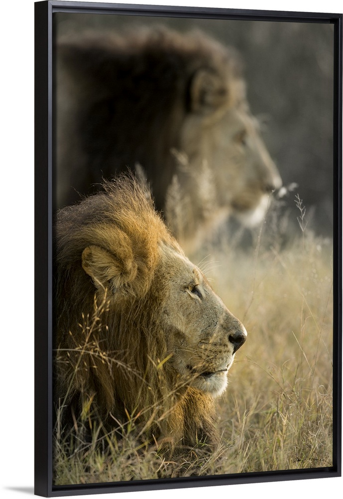 <p>Africa, Botswana, Moremi Game Reserve, Adult Male Lions (Panthera Leo) in morning sun in Okavango Delta.</p>