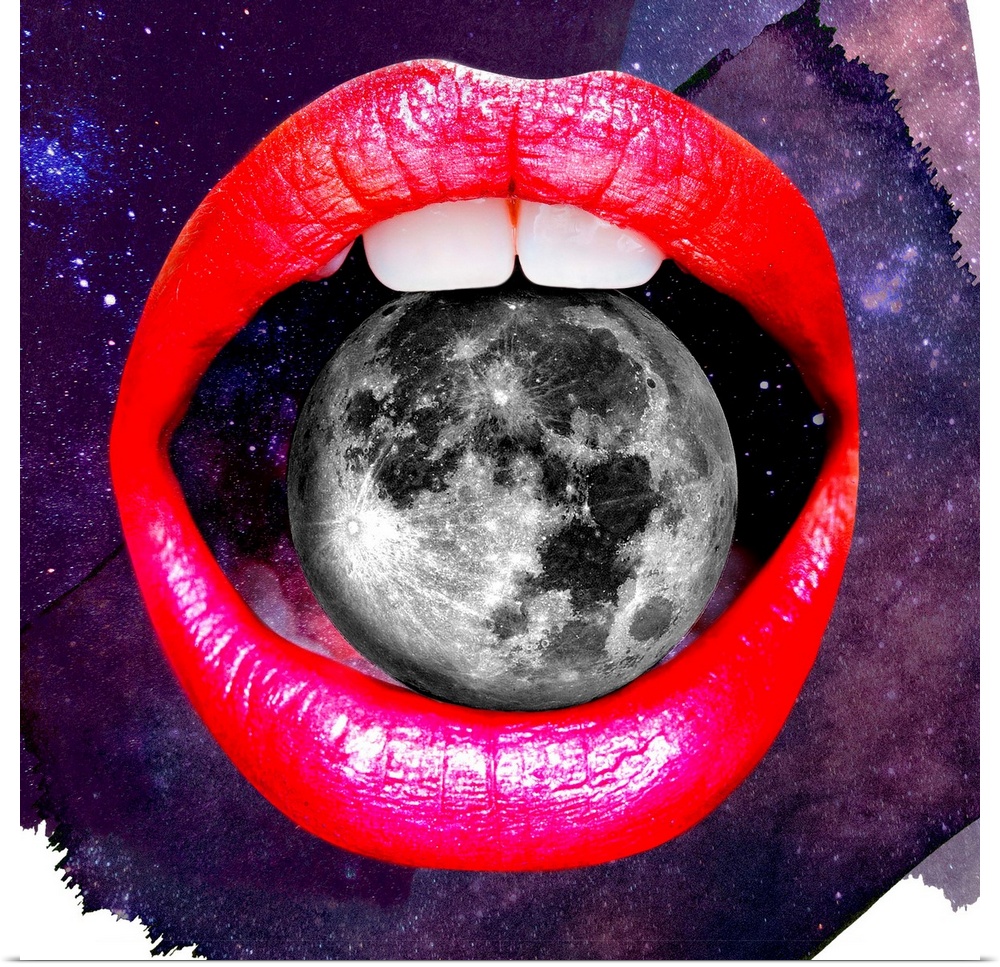 <p>A funky, pop art image of a pair of brightly colored lips holding the moon between their teeth.</p>