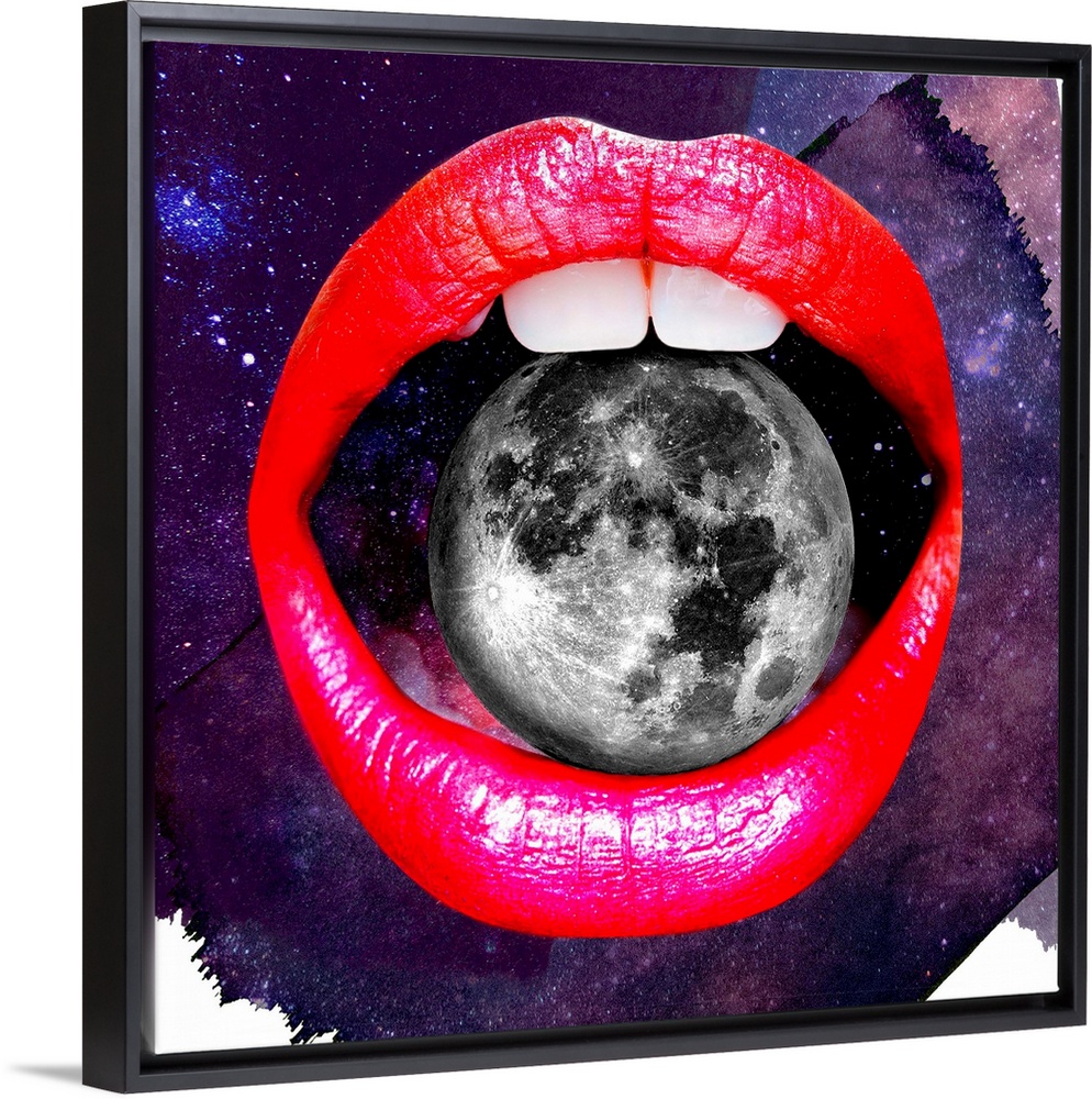 <p>A funky, pop art image of a pair of brightly colored lips holding the moon between their teeth.</p>
