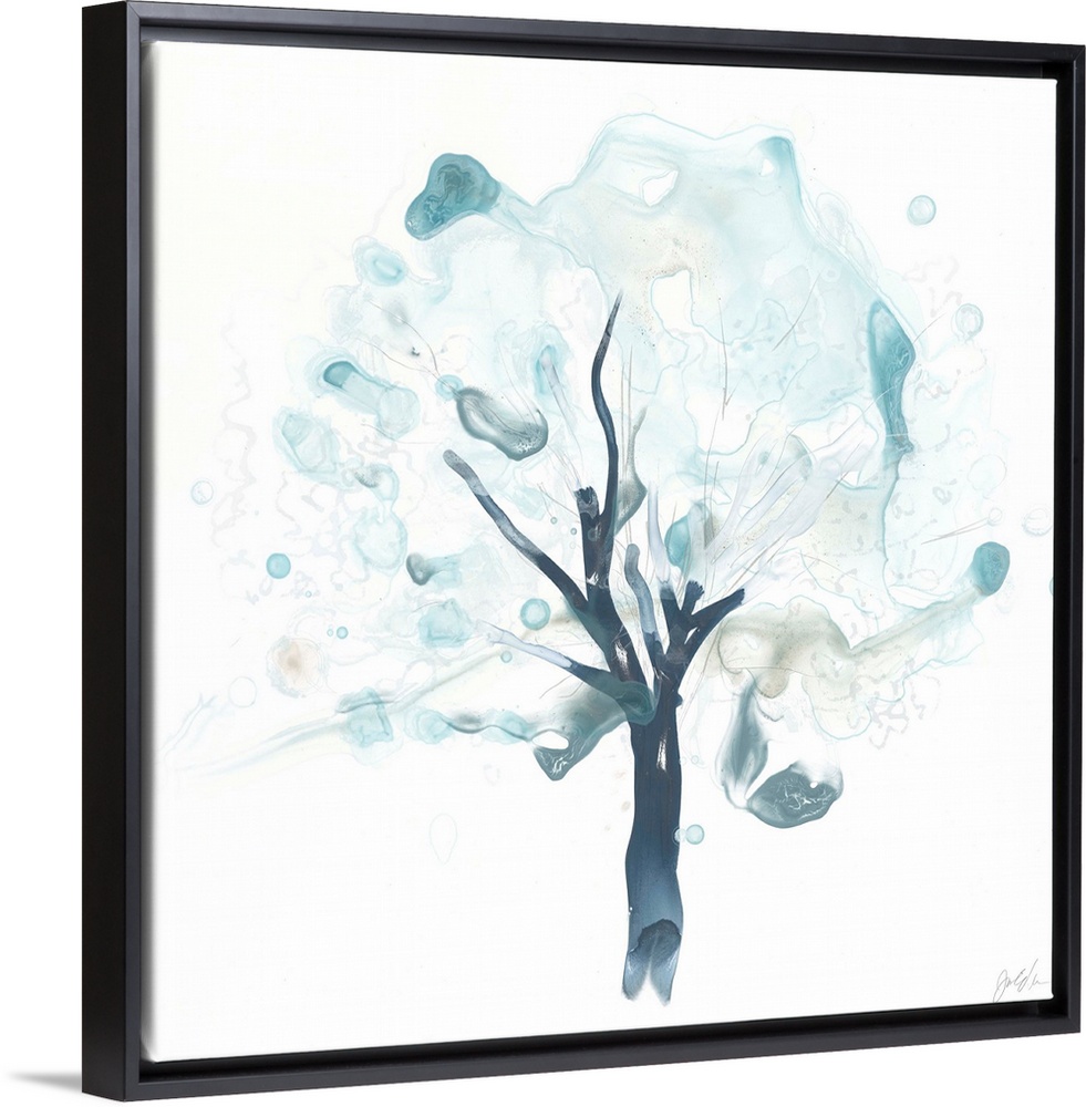 <p>Watercolor painting of a tree in watered down blue shades with blurred spots.</p>