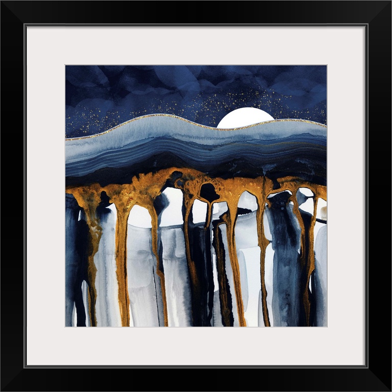 <p>Abstract depiction of a landscape with liquid hills, blue, gold white.</p>