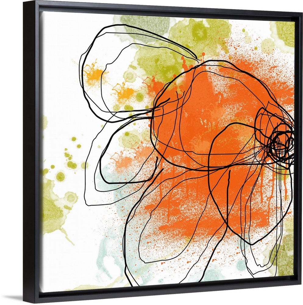 <p>Large contemporary art shows an illustration of an outlined flower against a backdrop interspersed with splashes of a few bright colors.</p>