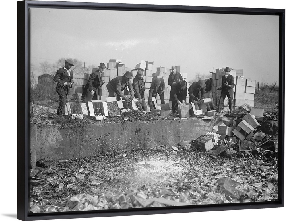 <p>Group of men destroying bootleg liquor and beer during Prohibition in America. Photograph, 20 November 1923.</p>