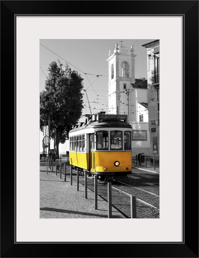 <p>Old yellow tram over black and white background in Lisbon, Portugal.</p>