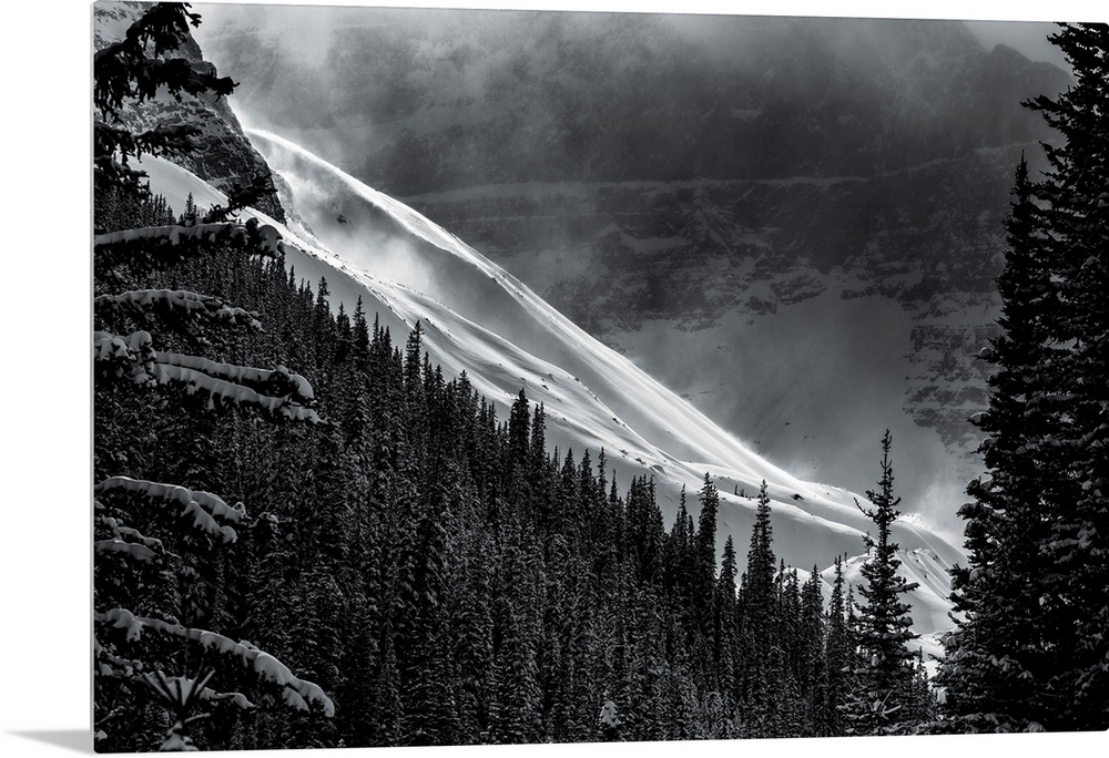 <p>Dramatically lit glacier amongst snow covered evergreen trees and a mountain cliff in the background.</p>