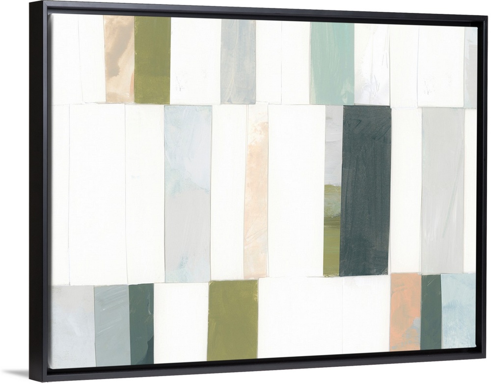 <p>A blocky contemporary abstract painting featuring vertical rectangular shapes in cool coastal colors and lots of white</p>