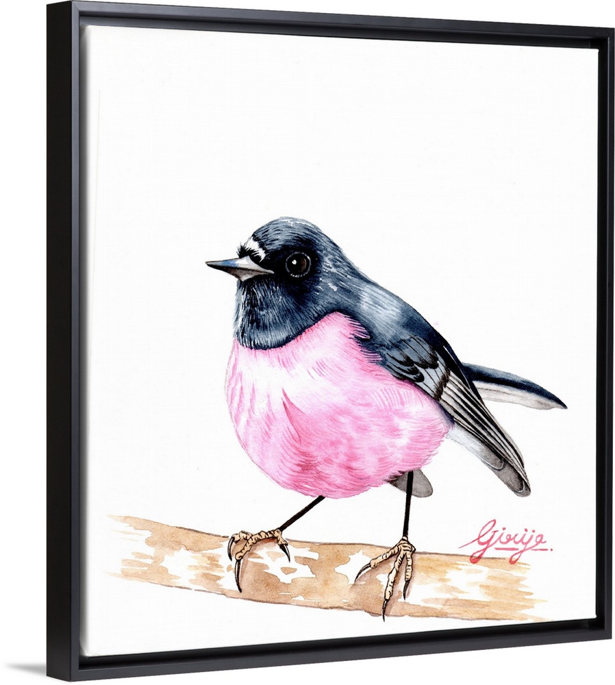 <p>The rose robin is a small passerine bird native to Australia. The male has a distinctive pink breast. Its upperparts are dark grey with white frons, and its tail black with white tips. This pink bird is painted in watercolor on paper.</p>