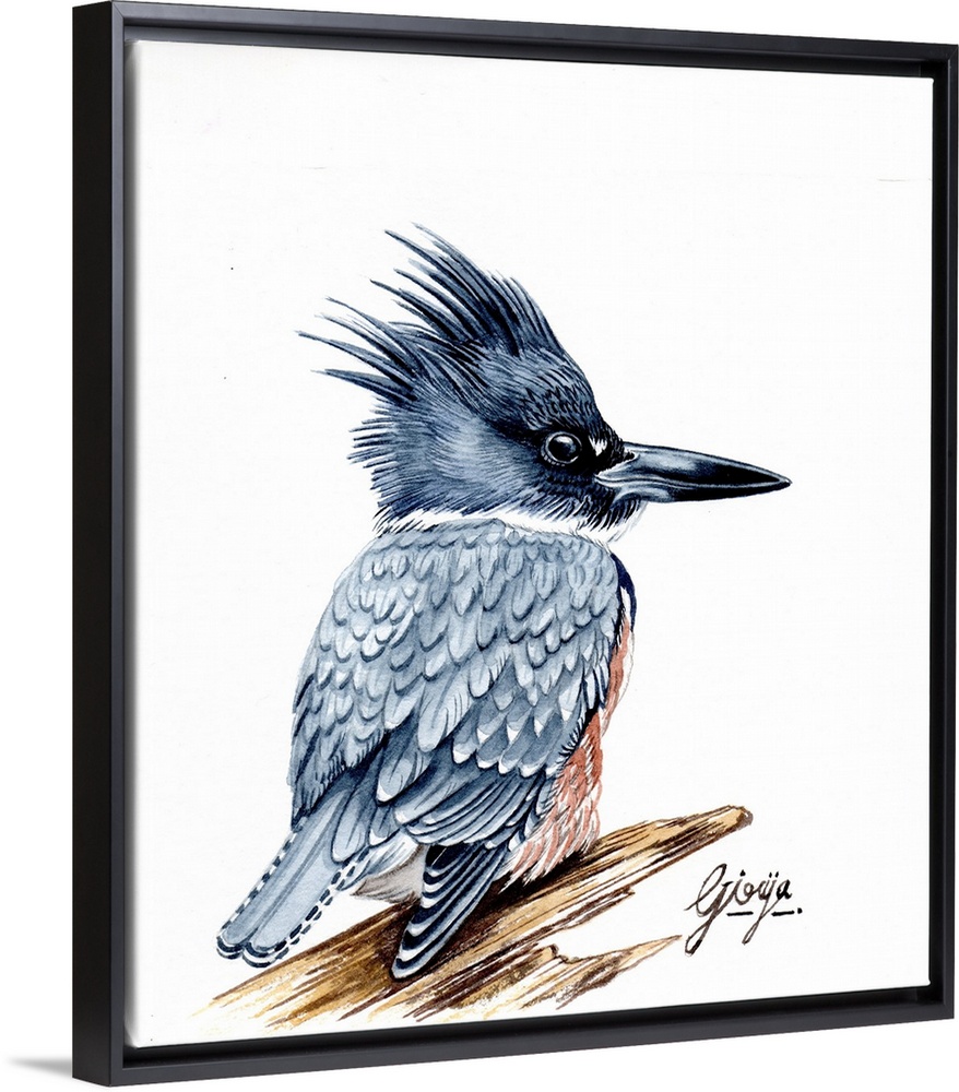 <p>The belted kingfisher is a stocky, medium-sized bird; this species has a large head with a shaggy crest. Its long, heavy bill is black with a grey base. This beautiful bird is painted in watercolor on paper.</p>