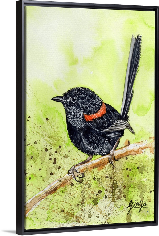 <p>This little black bird with red feathers around the neck is red backed fairy wren bird painted in watercolor on paper.</p>