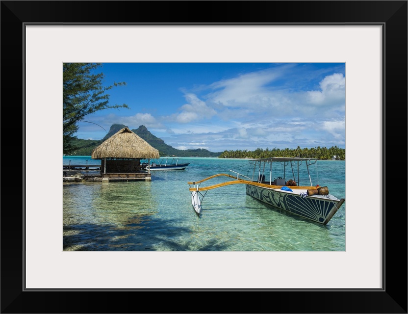 <p>Little boat anchoring on a small Motu, Bora Bora, Society Islands, French Polynesia</p>