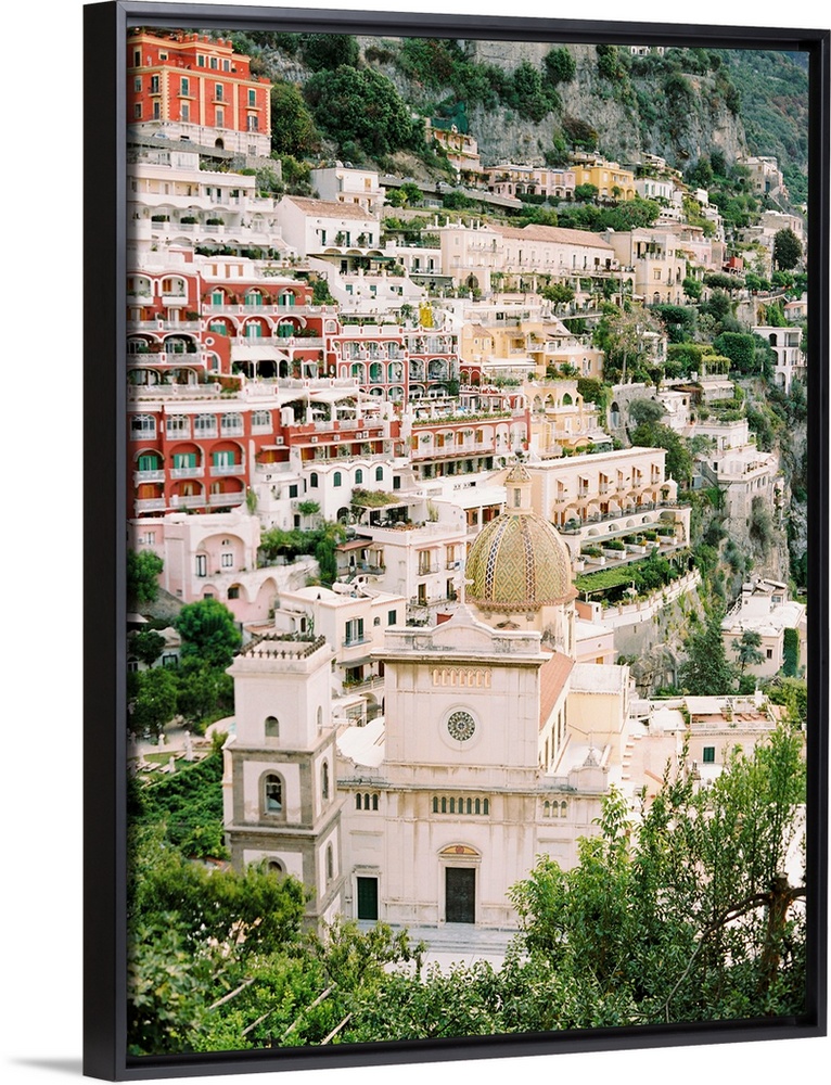 <p>Photograph of the houses and buildings of Positano, Italy perched on the steep hillside.</p>