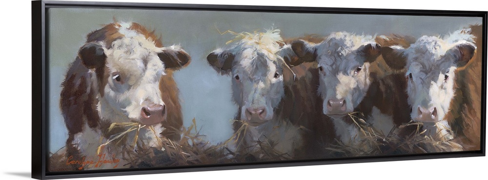 <p>Contemporary painting of a bull and three cows eating hay.</p>