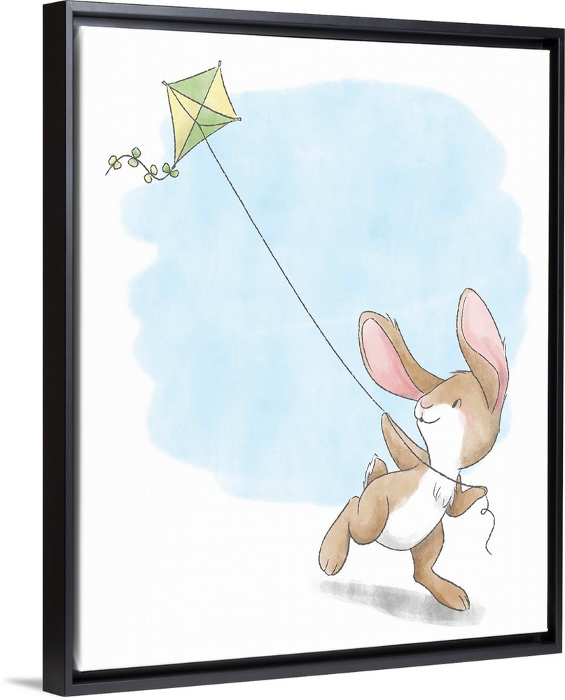 <p>Watercolor nursery illustration of a brown bunny flying a green and yellow kite.</p>