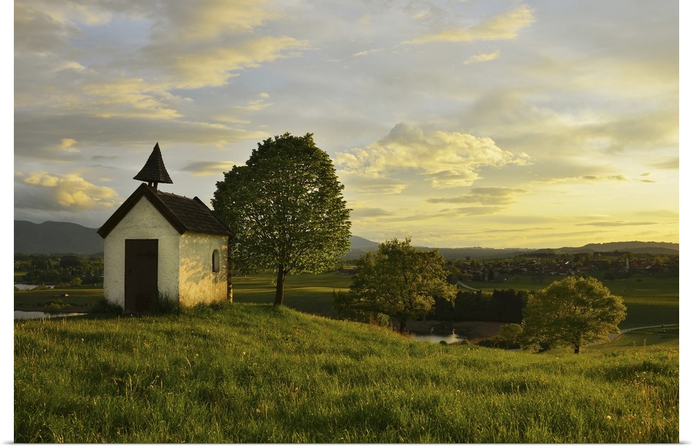 <p>Little Chapel with Tree at Sunset in Spring, Aidlinger Hohe, Bavaria, Germany</p>