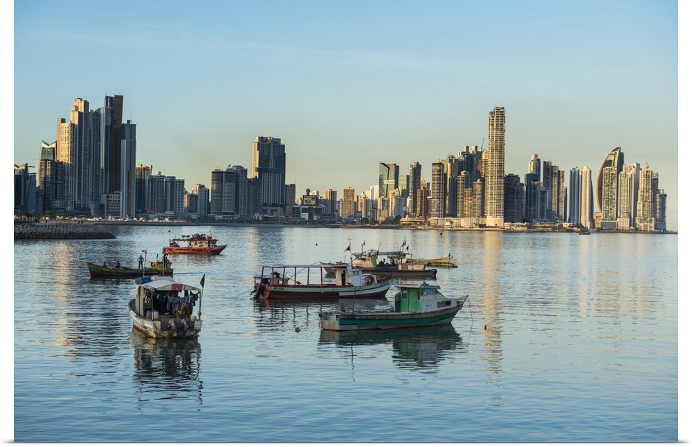 <p>Little fishing boats and the skyline of Panama City, Panama</p>