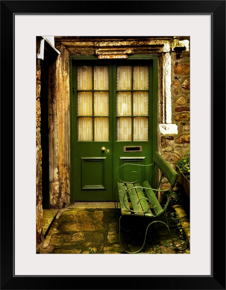 <p>A doorway and a bench at a cottage</p>