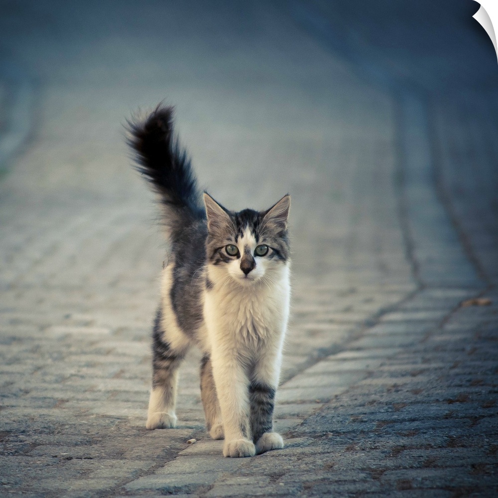 <p>An alley cat with white markings and a fluffy tail standing in a cobblestone street.</p>