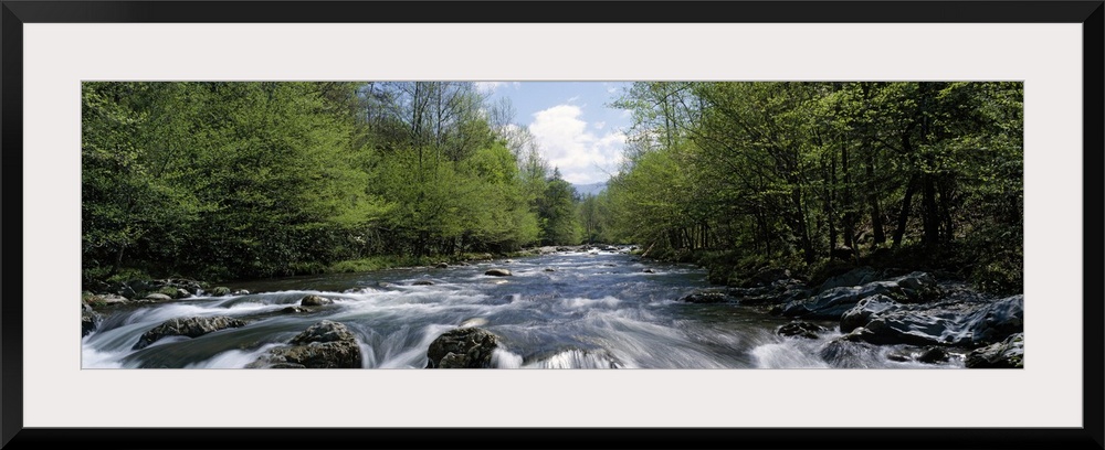 <p>A river filled with boulders and rapids rushes through the forest in this panoramic photograph for decorative wall art.</p>