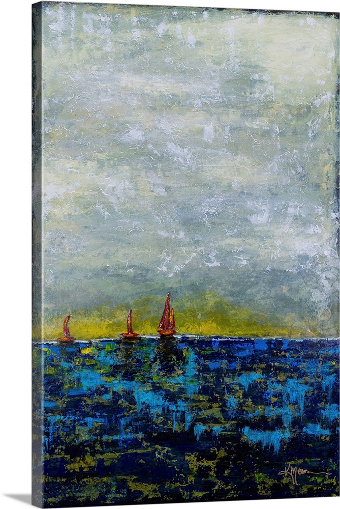 <p>Textured abstract-impressionist painting of three sailboats on a vibrant blue sea under a moody sky with a golden horizon.</p>