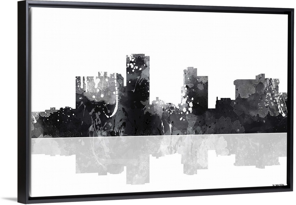 <p>Contemporary black and white watercolor skyline casting a mirror-like reflection below.</p>