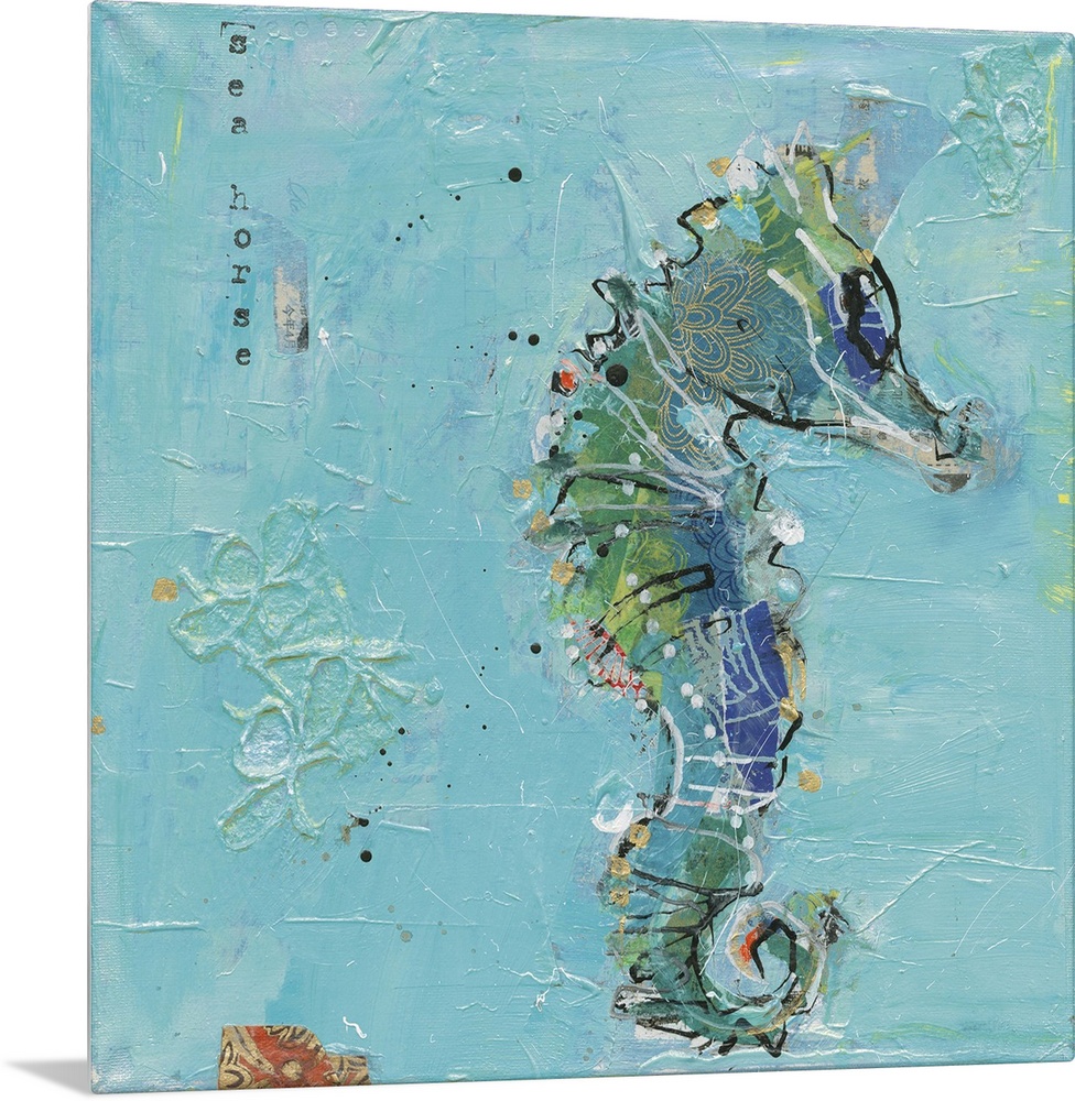<p>Square abstract painting of a seahorse with a light blue textured background and the word "Seahorse" stamped on the top.</p>
