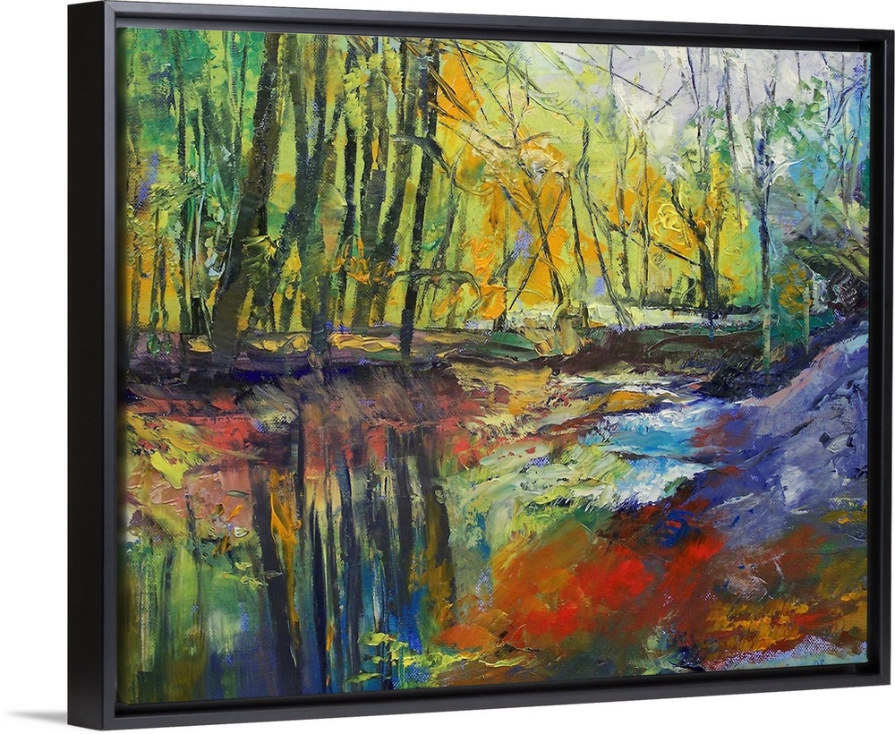 <p>Brightly colored oil painting of a stream running through the forest. The tall trees and clear sky is reflected in the stream.</p>