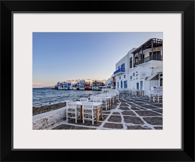 <p>Little Venice at sunrise, Chora, Mykonos Town, Mykonos Island, Cyclades, Greek Islands, Greece, Europe</p>