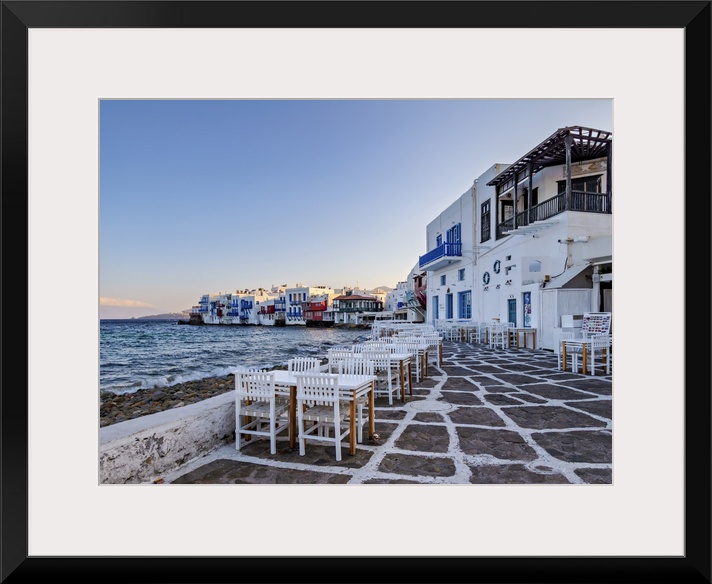 <p>Little Venice at sunrise, Chora, Mykonos Town, Mykonos Island, Cyclades, Greek Islands, Greece, Europe</p>