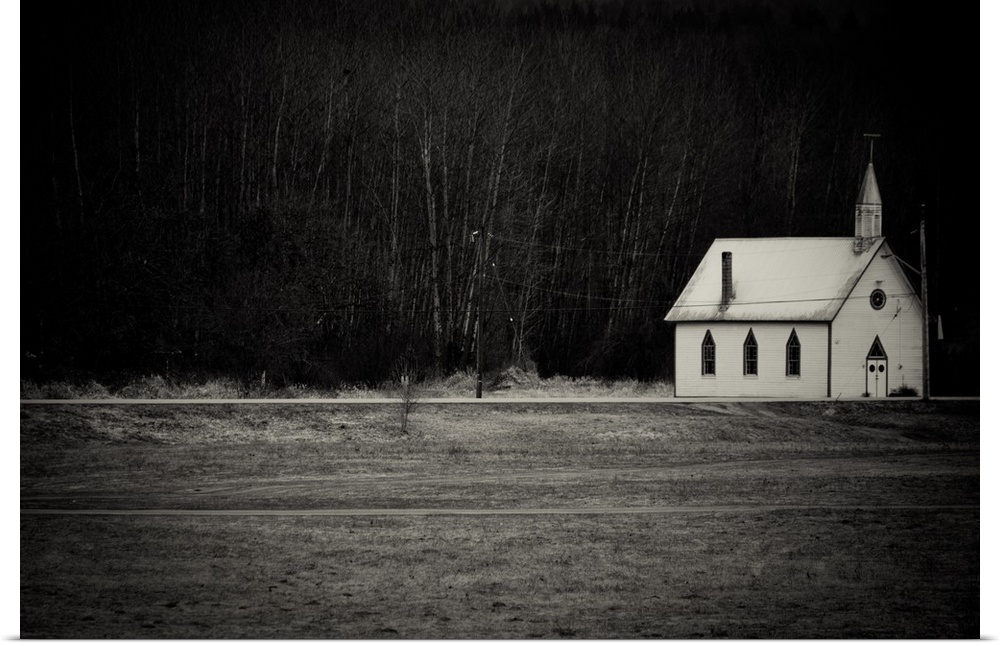 <p>A little white church sitting in the woods looking deserted.</p>