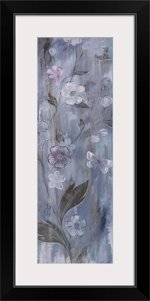 <p>Contemporary painting of pale icy blue flowers against a muted purple background.</p>