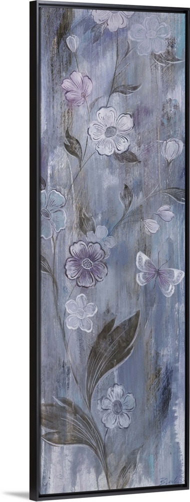 <p>Contemporary painting of pale icy blue flowers against a muted purple background.</p>