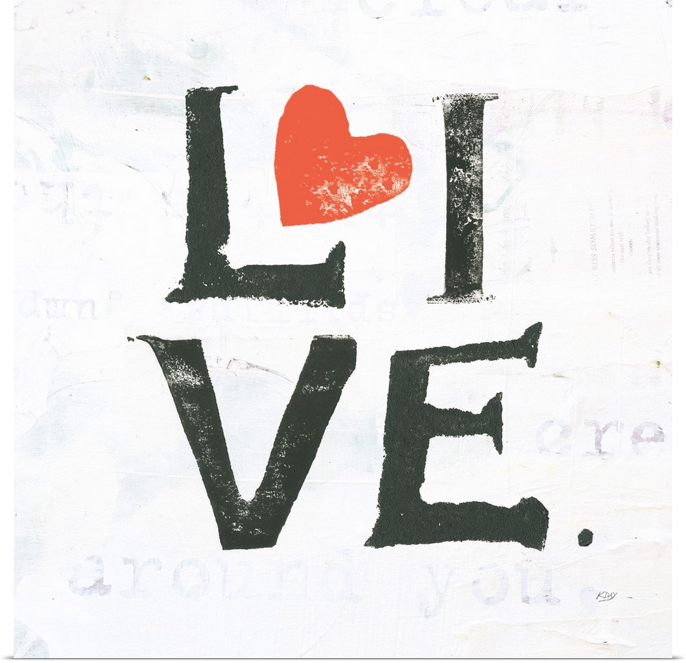 <p>Square painting with the word "live" written in two lines with red hearts on a white background with faded text and doodles, created with mixed media.</p>