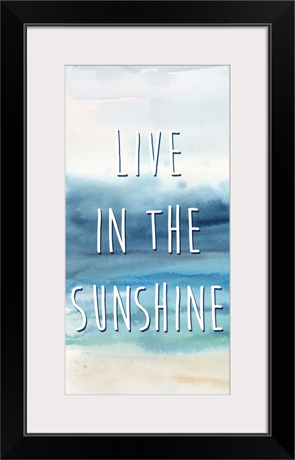 <p>"Live In The Sunshine" in white on a watercolor painting of the ocean.</p>