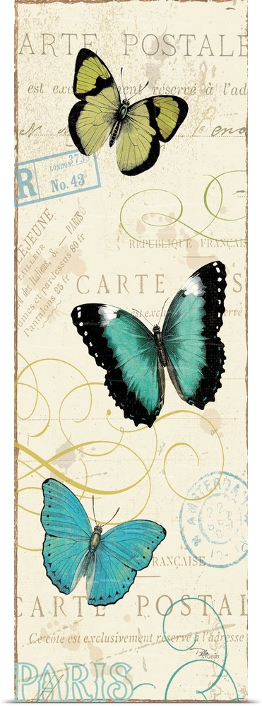 <p>Contemporary artwork of three butterflies running vertically in the frame. Against a beige background with text.</p>