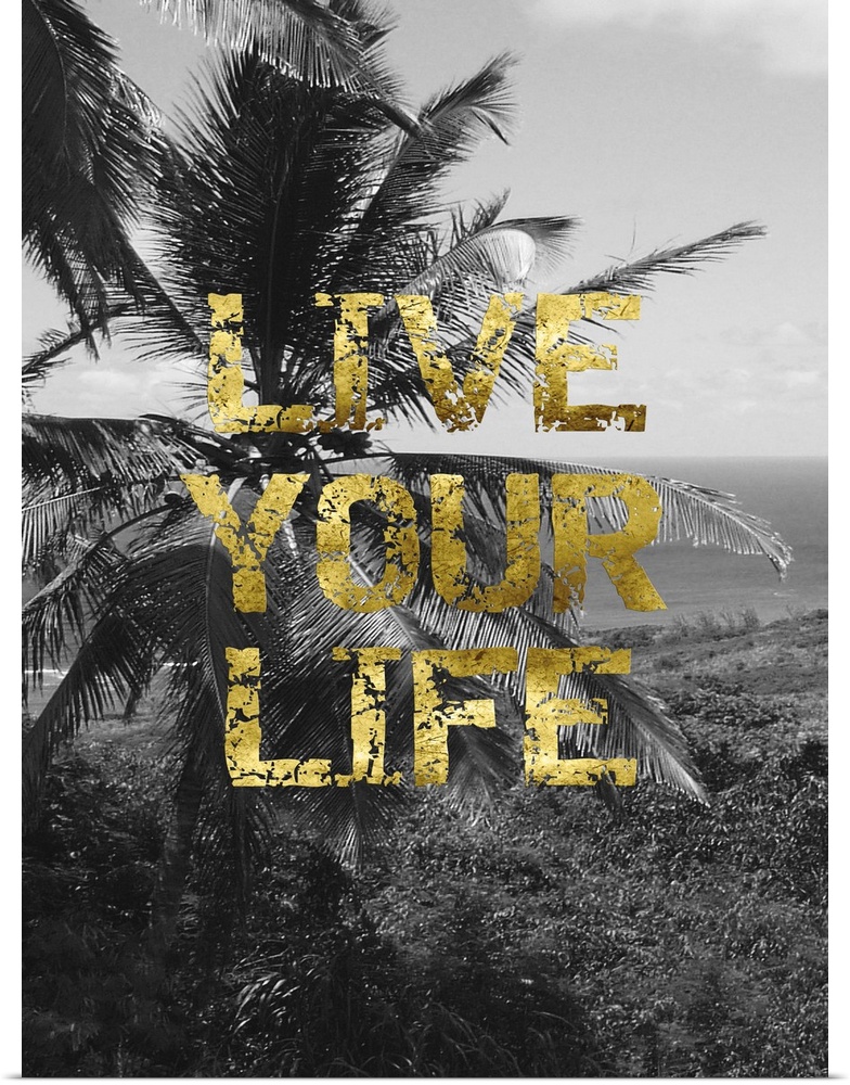 <p>"Live your life" written on top of a black and white photo of a beach scene with palm trees.</p>