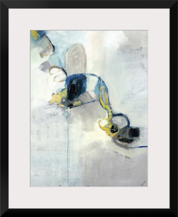 <p>Contemporary abstract painting using pale gray and blue tones with cascading organic shapes in vibrant colors.</p>