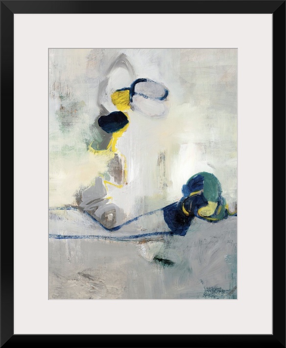 <p>Contemporary abstract painting using pale gray and blue tones with cascading organic shapes in vibrant colors.</p>