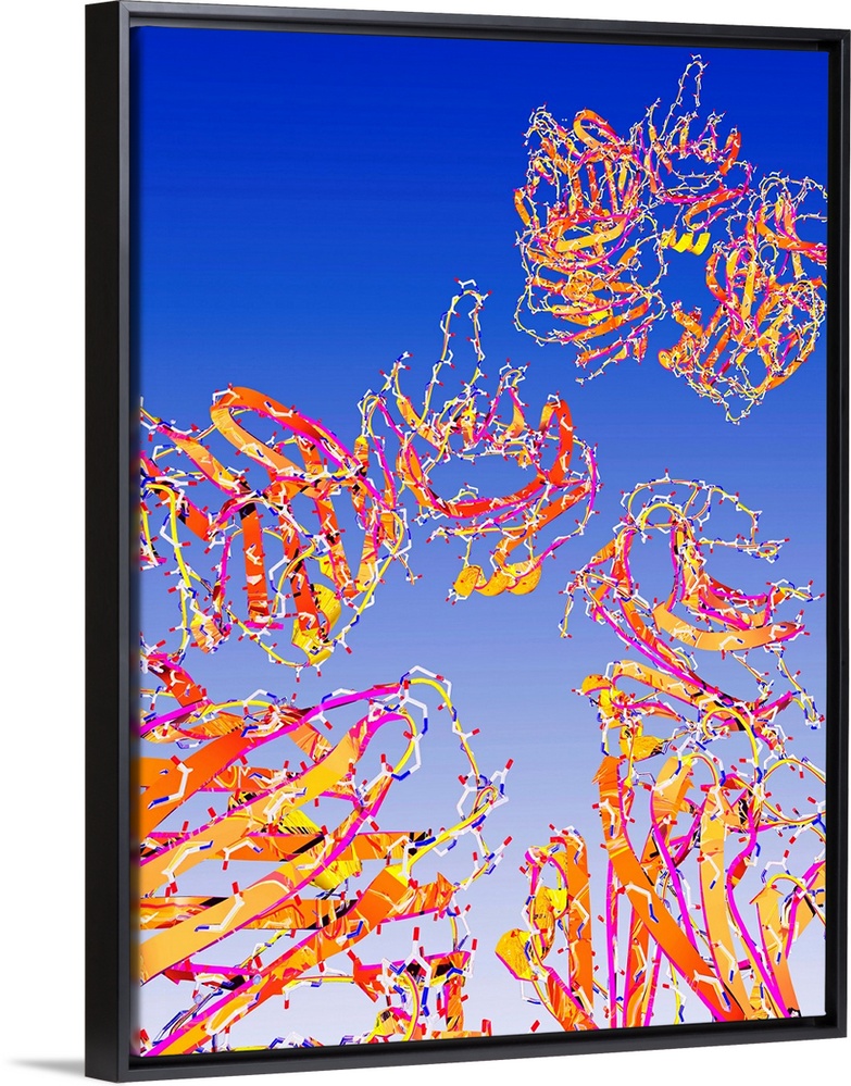 <p>C-reactive proteins, computer artwork. C-reactive proteins (CRPs) are produced by the liver during periods of acute inflammation. They act as pointers to inflammation in the body, with the presence of CRPs tested to diagnose conditions such as arthritis and Crohn's disease. Secondary structure of the protein shown.</p>