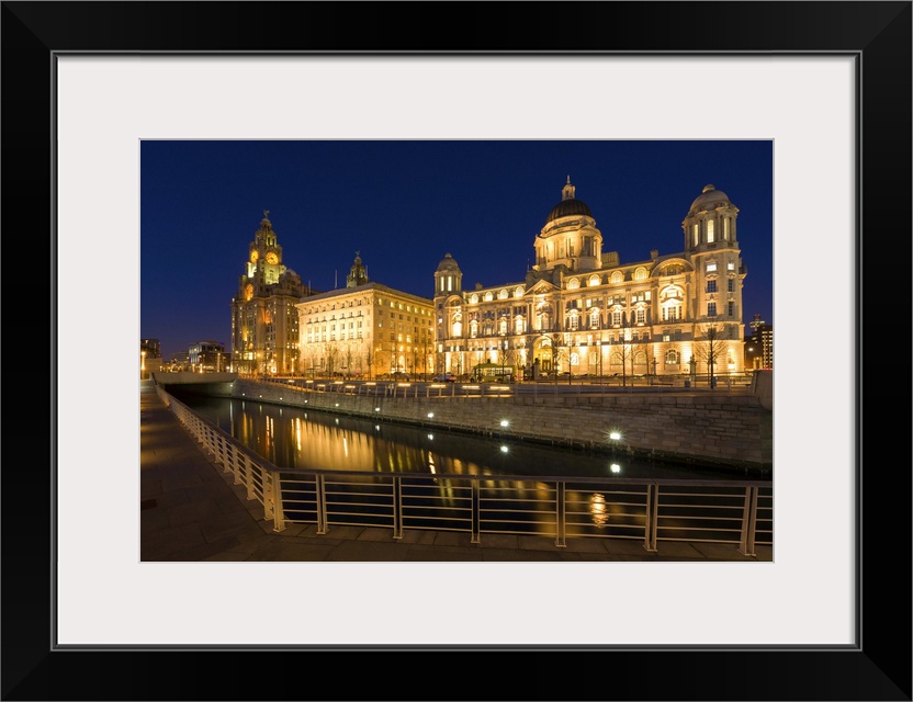 <p>Liver Building, Cunard and Port of Liverpool buildings at the Pier Head at night</p>