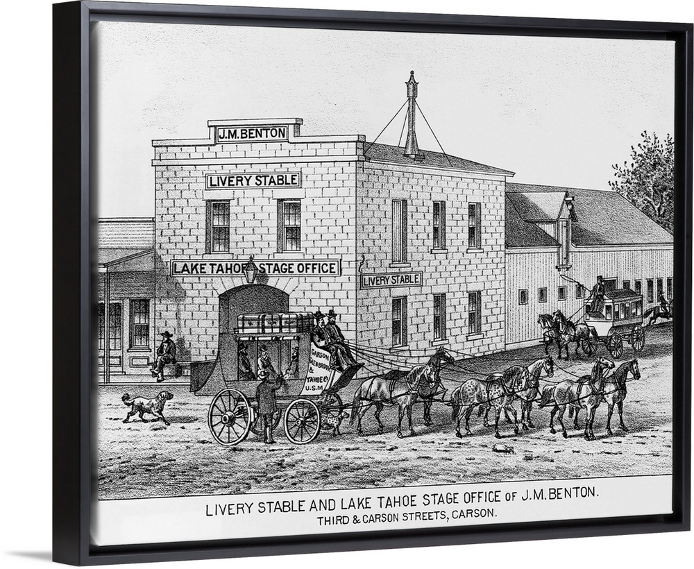 <p>A stagecoach parked outside the livery stable and office of the Lake Tahoe Stage Company prepares for departure, Carson City, Nevada, 1881.</p>