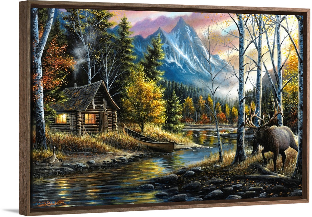 Art Chuck Black Cabin Wall Art Contemporary Art Landscapes Mountains River, Creek and Stream Painting Wildlife Moose and Elk