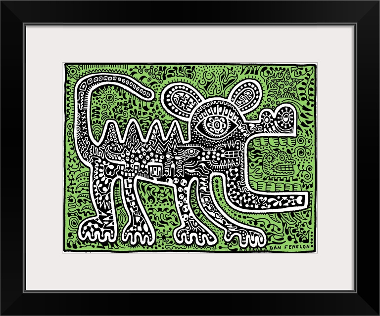 <p>Contemporary abstract artwork in an urban art style of a lizard filled in with tons of intricate detail against a background of equal detail in bright green.</p>