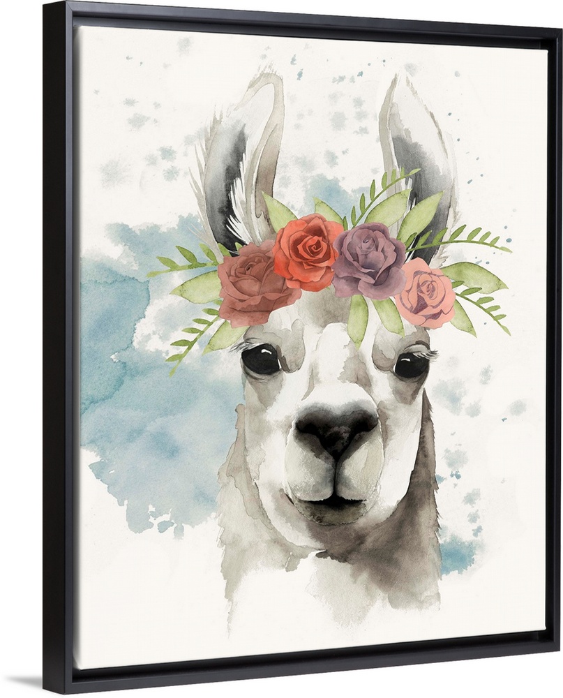 <p>Watercolor portrait of a llama wearing a crown of roses.</p>