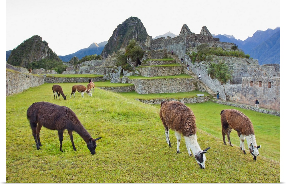 <p>Llamas eating on the grounds of the Inca ruins of Machu Picchu.</p>