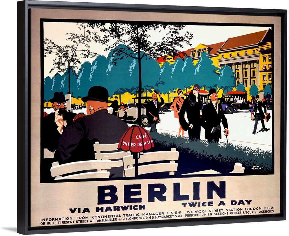 <p>A pre-war scene at a Berlin sidewalk cafe. For the LNER's twice-daily train to Berlin, Newbould gives us a magnificent image of a pre-war scene at a Berlin sidewalk cafe. He arrests us not only with superbl dilineated characters but with his special use of flat colors in odd but eye-catching tones, including magenta, teal blue, puce and olive, as well as an effective use of black and beige.</p>