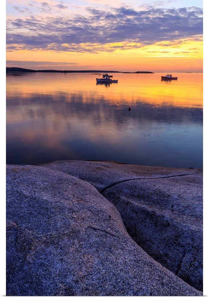 <p>Lobster boats in a harbor in South Thomaston, Maine at sunrise.</p>