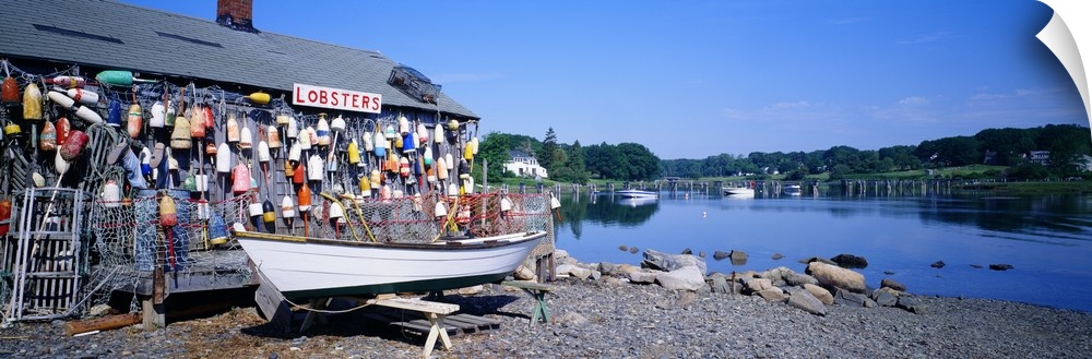 <p>Panoramic photograph taken of a lobster shack with small buoys lining one side of it that sits on the edge of a body of water.</p>