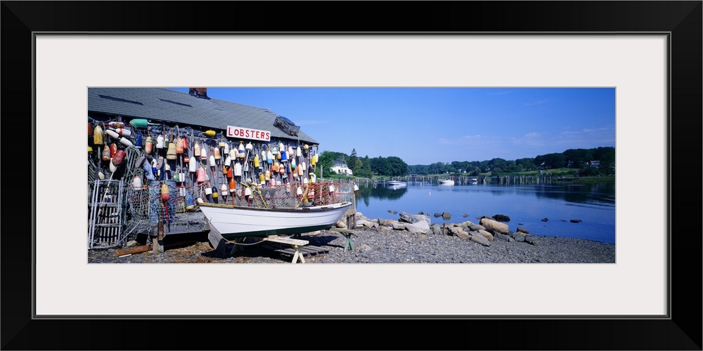 <p>Panoramic photograph taken of a lobster shack with small buoys lining one side of it that sits on the edge of a body of water.</p>