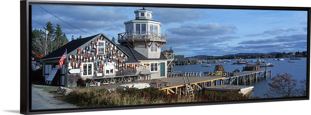 <p>This is a lobster village in New England. There is a long pier with lobster traps stacked up at the end. It is the southwest harbor with a large fishing house with a tower. There are fishing buoys attached to the side of the building. There are small boats tied up in the harbor beyond the pier.</p>