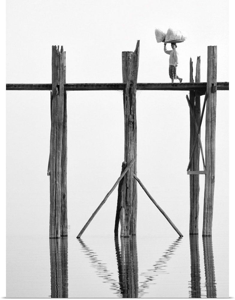 <p>Local woman carrying goods on her head across U Bein Bridge, the world's longest teak foot bridge spanning 1300 yards over Taungthaman Lake, Amarapura, near Mandalay, Myanmar.</p>